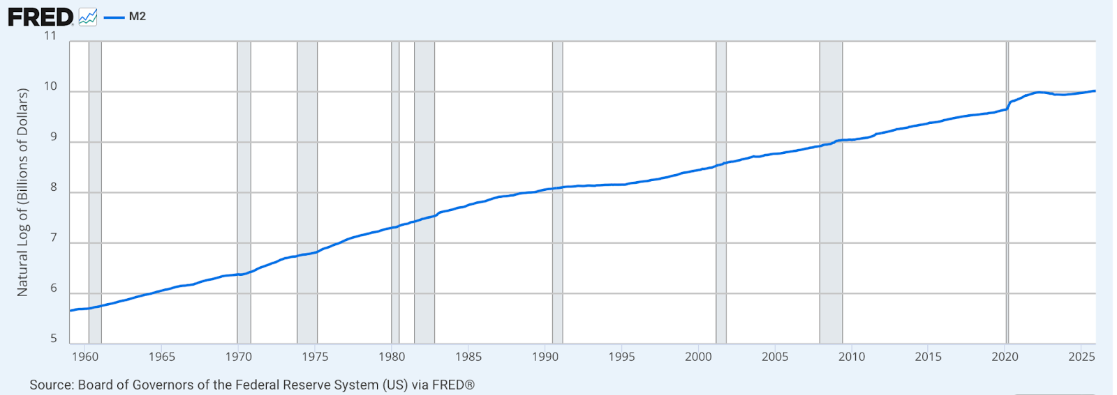 The chart above is the expansion of the United States Money Supply starting in 1959. Albeit “tied” to gold at the time, one can see the linear rise in supply which, led by the French repatriating their gold, forced Nixon to close gold convertibility and took the United States off the gold standard. This line continues in a near perfect linear fashion, with a slight blip during Covid, to today. The Y-Axis is logarithmic, normalizing the compounding nature of this chart. Observing the trendline, we can extrapolate this over the next decade revealing a true hockey stick in nominal figures. With an average 7%, we can assume the money supply will continue doubling every 10 years. As von Mises states, that is the fundamental definition of inflation, and that new money will always need to find a home.