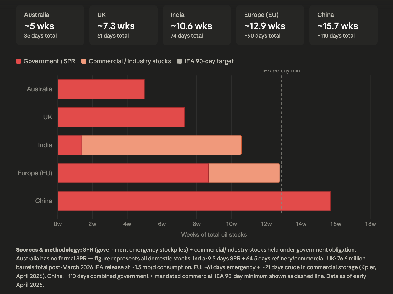 Australia, the UK, India, the EU, and China are all being starved of oil. The chart below provides an overview of the strategic reserve and existing commercial inventory available in key regions worldwide.