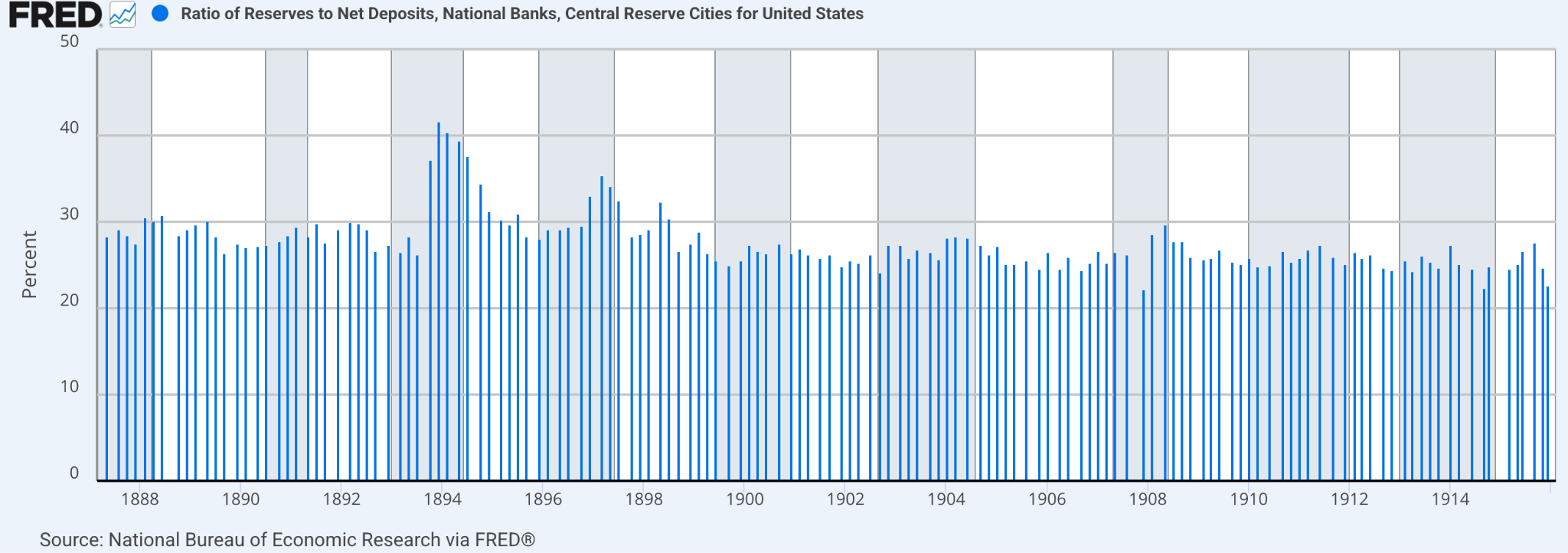 When we deposit money at the bank, the bank marks that deposit as a liability. To supplement this new liability, the bank loans out the money, creating an asset which balances out the deposit. Historically, as the bank loans out money, a reserve is kept in case the depositor needs their money back. This is a reserve ratio. The chart below shows the historic ratio from 1885 to 1915.